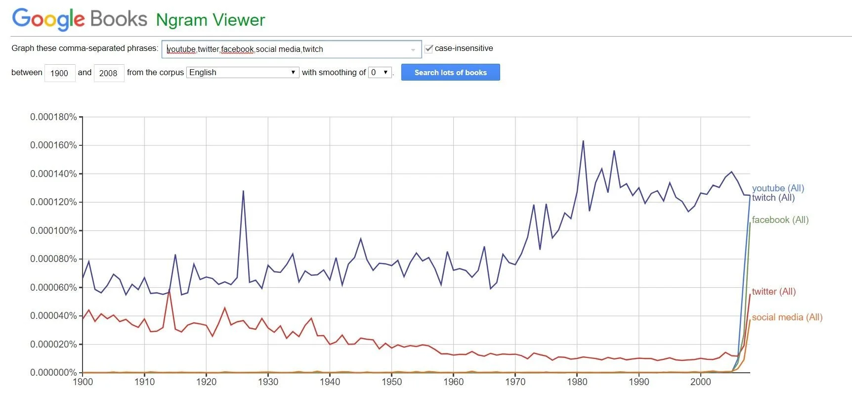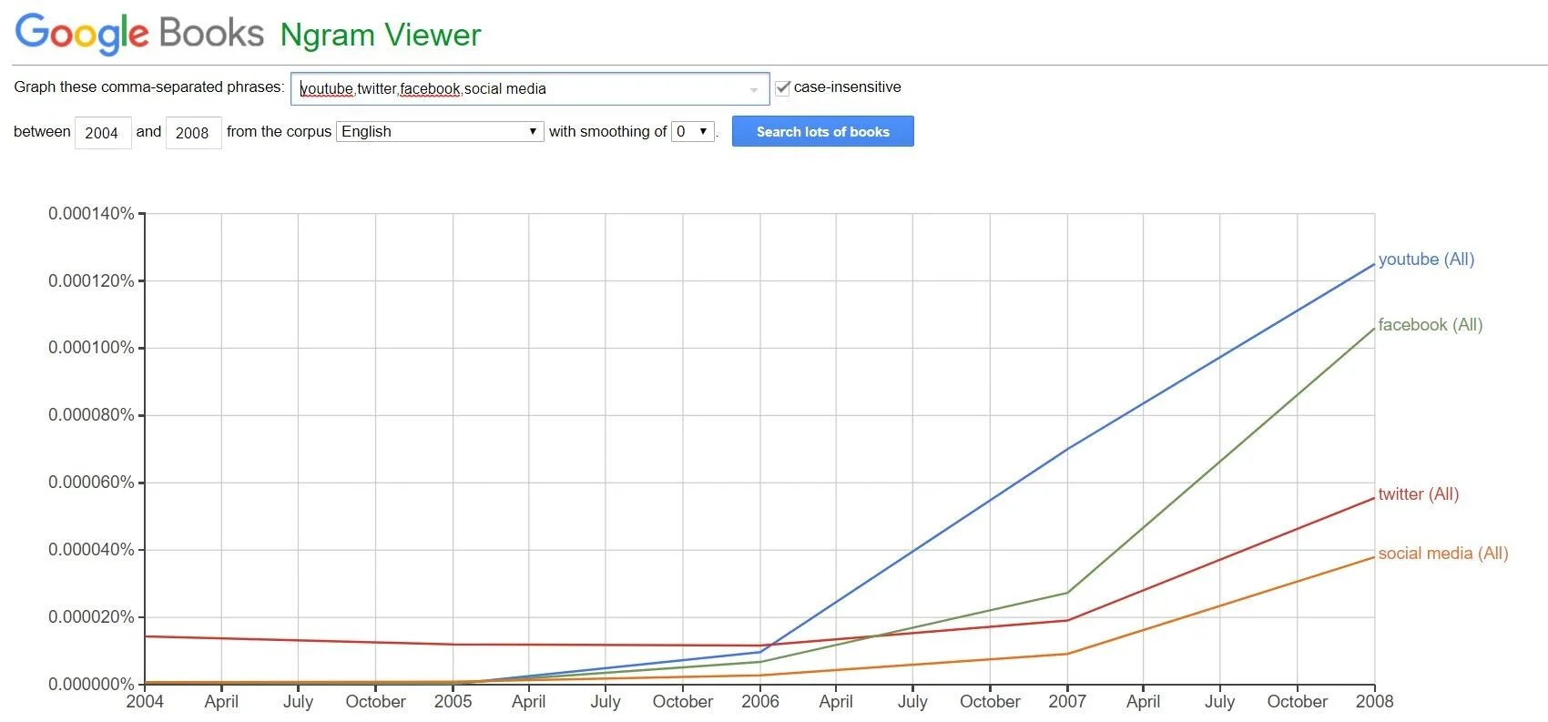 Finally Figure 4 shows a detailed view of the proliferation of social media related words in general literature by limiting the search period to 2004 to 2008. This clearly shows the atmospheric rise of YouTube as a medium, and supports the supposition that YouTube is the chosen interface for a significant audience engaging with a certain style of staged performance.