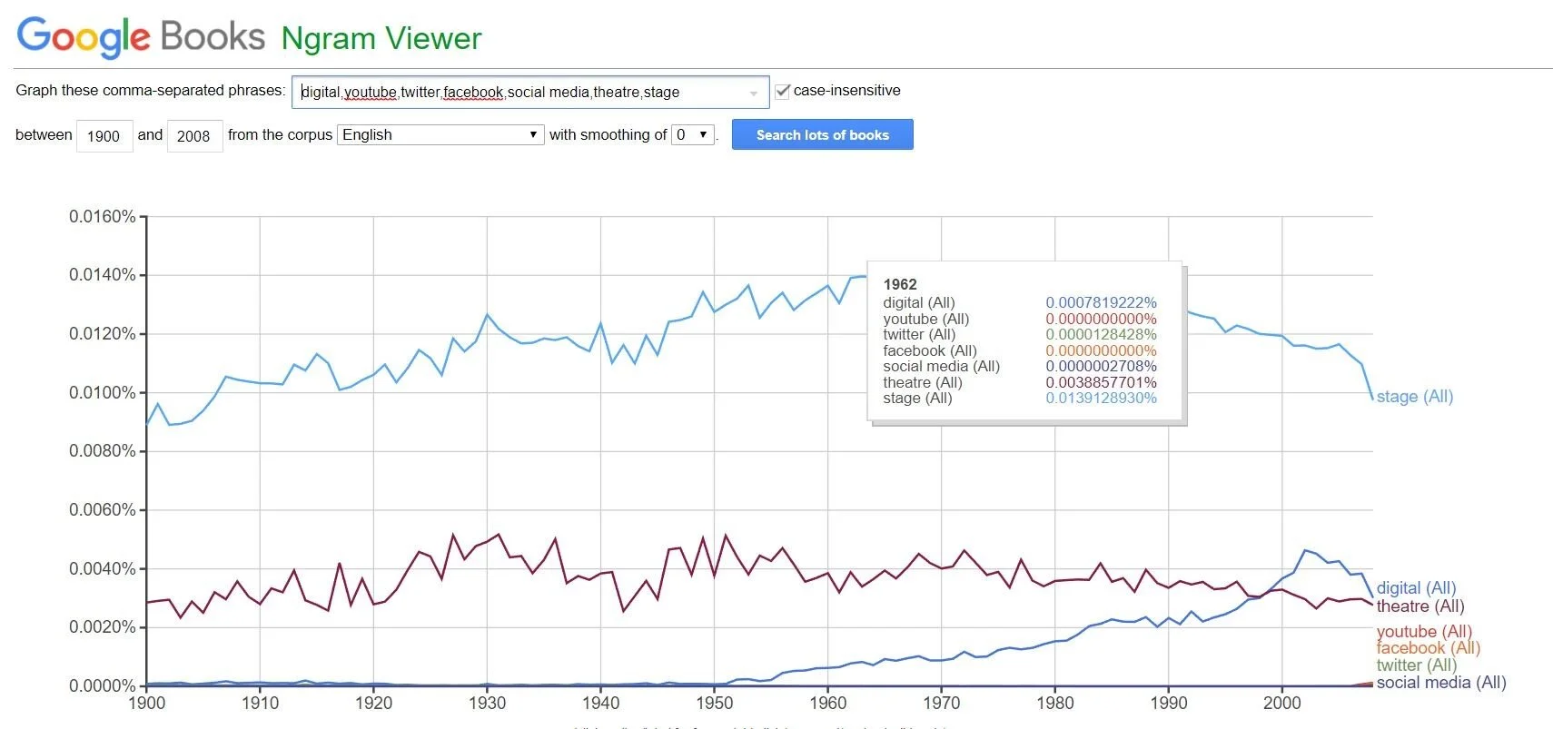 Figure 2 begins by analysing the proliferation of the words digital, stage, and theatre against the words YouTube, Twitter, Facebook, and social media from 1900 to 2008. The sharp upturn of previously unused words relating to social media can be seen, as can an odd recent decline in the word digital. This could possibly be explained by digital becoming commonplace, and therefore not needing referencing in modern literature. The upswing in new terms is mirrored by a sharp and recent decline particularly in the word stage.
