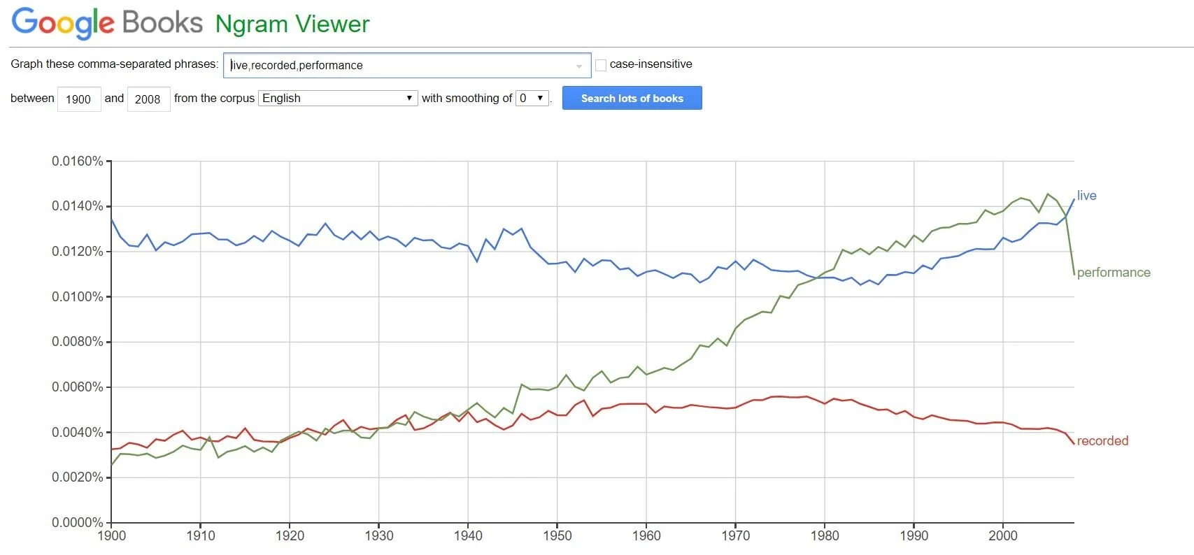 In terms of the more recent changes shown in Figure 1, and in accordance with both Aulander’s arguments and the way that literature often reflects cultural and social developments, it was expected that, despite the multiple linguistic meanings and uses of the words themselves, there would be a reduction in the use of the word live and a simultaneous increase in the words recorded and performance, when Figure 1 apparently shows the opposite to be the case, with results most pronounced for the word performance. It is possible that the increasing academic and media attention being drawn to the plight of modern theatre has skewed the results slightly, which are further limited by Google Ngram only being operational until 2008 inclusively, but these findings may instead support Auslander’s suspicion that the loss of liveness stems in part from the economic impact on Broadway of productions beginning as an art-piece “designed for reproducibility” (Benjamin, 1936, p19), rather than being a true live performance. “I noticed that a number of the Broadway productions I was seeing had been underwritten in part by cable television money on the understanding that taped versions of the productions would appear later on cable networks…the productions themselves (particularly their sets, but also their staging) were clearly ‘camera-ready’ – preadjusted to the aspect ratio, intimate scale, and relative lack of detail of the television image” (Auslander, 2008, p30). There is certainly an approximate change from around 1980 in the use of these words in popular literature.